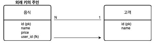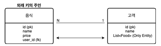 - 외래 키를 관리하는 주인은 음식 Entity이지만 실제 외래 키는 고객 Entity가 가지고 있습니다.