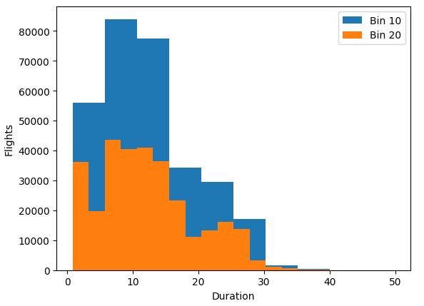 비행시간(duration) 데이터의 bins를 10과 20으로 설정하고 시각화해서 비교해보면