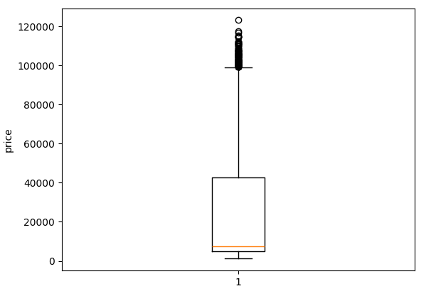 상자 그래프에서 알 수 있는 것은 가격 데이터의 범위는 0~120000 사이이지만 중앙값이 10000정도로 50%의 비행기는 10000 이하의 가격으로 판매된다는 것이다